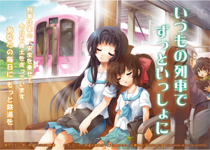 2009年ローカル鉄道応援ポスター ご紹介 「いつもの列車で ずっといっしょに」をキャッチコピーとして、「あなたの毎日にもっと鉄道を」と、鉄道の利用を訴えかけます。 萌え絵部分は、列車内で無防備にうたた寝する二人の少女を描き、日本の鉄道が安心できる・安全な交通機関であることを訴求します。イラストは漫画家・イラストレーターの山鳥おふうさんを起用しています。 鉄道広告の標準、B3サイズのポスターです。 車両は錦川鉄道の3000形気動車をモデルにしております。 キャッチコピー作成については某地元紙整理部の皆様にご協力いただきました。 印刷は毎度おなじみ金沢印刷さんです。 |