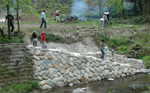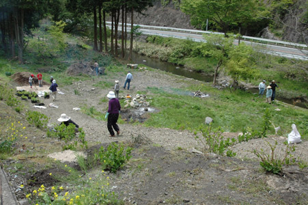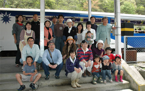 5月4日には、駅内外の雑木の枝打ちをした他、ホーム下の斜面にアジサイを200本と、川沿いにヤマザクラとモミジを植樹。また、カレーを70食用意して、メンバーの昼食にするほか、おとずれた観光客や鉄道ファンに無料でふるまっておられました(王舞もいただきました、ごちそうさまでした♪)。