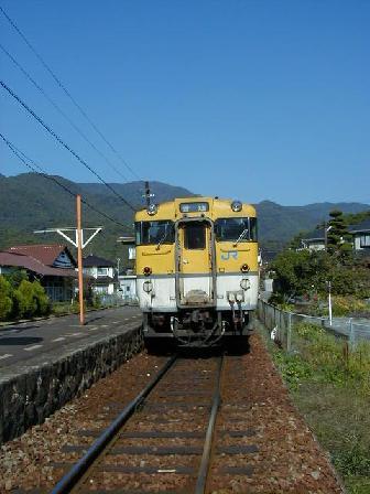 すばらしい秋晴れの午後、狩留家駅で憩うキハ47。狩留家では折り返し列車の設定があるので、時々列車がのんびりと発車時刻を待っている。撮影日11月10日は雲一つないきれいな青空が広がっていた。あまりに高い空の下で、後方に見える白木山がいつもより低く見えた。