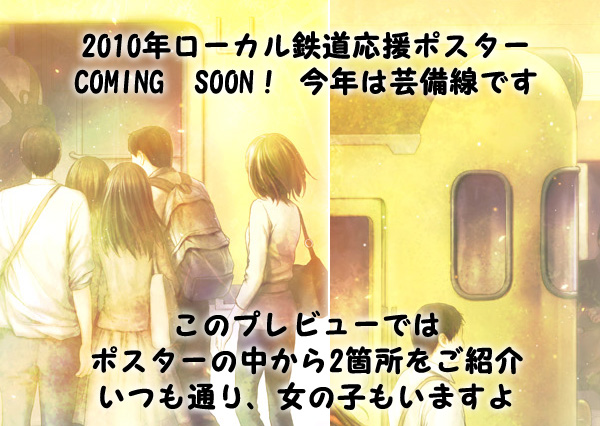 2010年ローカル鉄道応援ポスター ご紹介 「いいね、きしゃつう」をテーマとして、「乗ろう 活かそう ローカル鉄道」と、鉄道の利用促進をアピールします。 今回のイラストはイラストレーターの米良さんにお願いしました。 図案は、駅ホームでの少女同士の出会いを中心に、通勤通学で賑わう芸備線安芸矢口駅を、幻想的かつ爽やかに描きました。 あと数年で姿を消すであろう、広島一般色。その黄色い車体が光をまとって輝く姿は、イラスト表現ならでは。 鉄道広告の標準、B3サイズのポスターです。 車両はJR西日本キハ47形気動車(更新車)をモデルにしております。 印刷は芸備線つながりで、「芸備線米寿の軌跡」でおなじみの菁文社さんです。 |