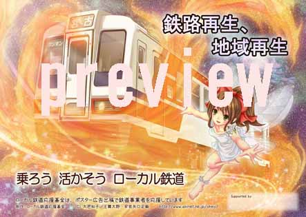 2011年ローカル鉄道応援ポスター ご紹介 東日本大震災で大きな被害を受けた三陸鉄道を念頭に、「鉄路再生、地域再生」をテーマとして、「乗ろう 活かそう ローカル鉄道」と、鉄道の復興と利用促進をアピールします。 今回のイラストはイラストレーターの大笆知子さんにお願いしました。 図案は、三陸鉄道の36形が不死鳥のオーラをまとい、希望のレールを走る姿をファンタジックに描いています。 鉄道広告の標準、B3サイズのポスターです。 印刷はDSゲーム「鉄道むすめ」で、広電車掌キャラ「鷹野みゆき」の実家のモデルとなった「お好み焼き 大野」さんの向かい、タカトープリントメディアさんにお願いをしております。 |