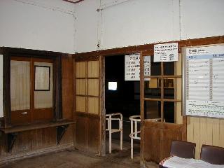 備中神代の駅舎内。奥は出札口。この引き戸を出ると1番線だ。木造駅舎の中で樹脂製のベンチと時刻表だけが異彩を放つ。