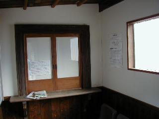 新待合室の内部。旧駅舎の窓口が切り取られて保存されている。この他にも部分的に旧駅舎のパーツが残って、かつての姿を忍ばせる。